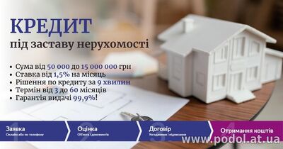 Кредит без офіційного працевлаштування під заставу нерухомості від 1,5% на місяць. Отримати кредит під заставу будинку під 18% річних. Оформити кредит під заставу квартири. Кредит під заставу землі під 18% річн